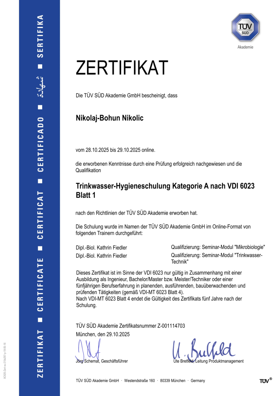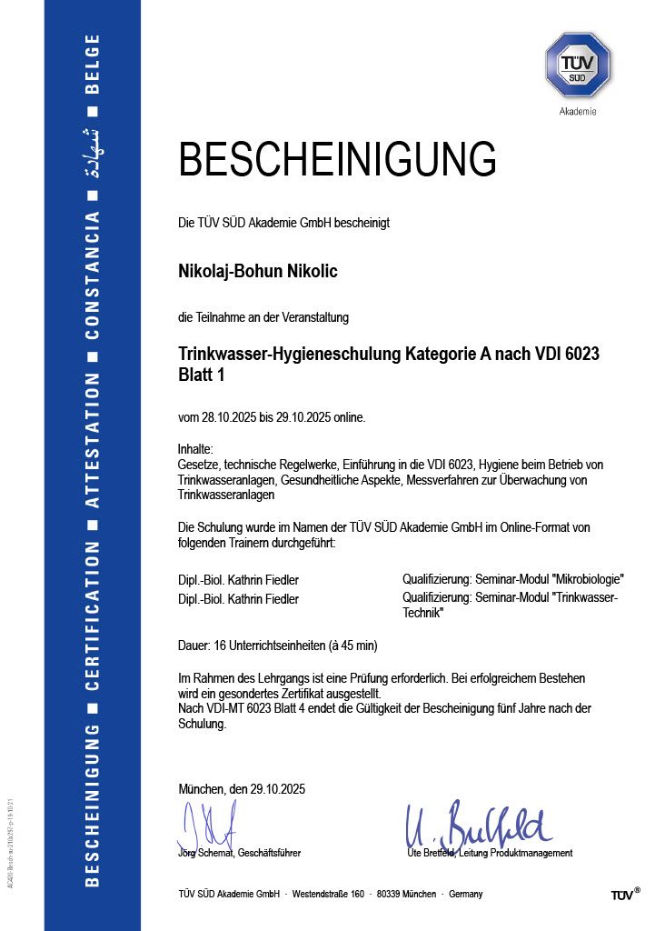 Zertifikat - Trinkwasser-Hygieneschulung Kategorie A nach VDI 6023 Blatt 1